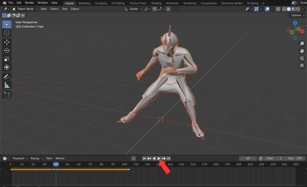 Pour importer le personnage 3D animé dans Blender, la méthode est la même que pour un personnage 3D statique. Une fois votre personnage importé dans Blender, vous pouvez le voir en mouvement en cliquant sur le bouton « Play » de votre Timeline.